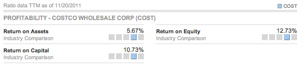 회사에 대해서도 조금 조사해보기로 했다. 난 회사의 전체적인 모습을 간략하게 보고 싶으면 비즈니스 위크(Business Week)의 기업 인사이트 센터(Company Insight Center)를 가장 즐겨 이용한다. 특히 비율(Ratio)을 보는 것을 좋아하는데 코스트의 Ratio는 다음과 같다.