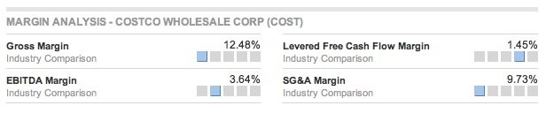 매상 총이익(Gross Margin)은 업계에 비해 낮은 편이다. 그만큼 물건을 싸게 팔고 이익을 별로 안남긴다는 뜻이다. 여기에서 9.73%에 불과한 SG&A (Selling, General, and Administrative Expense: 직원 급여, 복지 비용, 세금, 임원 보수 등)등등을 빼고 나면 EBITDA 마진(법인세와 감가 상각 등을 제외한 순 이익)이 3.64%밖에 안된다 (그래도 우습게 볼 일은 아니다. 코스트코의 연간 순이익은 1.6조원이 넘는다). 이를 미국의 프리미엄 그로서리(Grocery) 스토어인 홀푸드와 비교하면 차이를 명확하게 알 수 있다.
