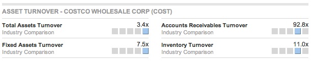 위에서 보면, 동종 업계에 비해 모든 회전율 지표가 높게 나타난다. 특히 재고자산 회전율(Inventory Turnover)이 높은데, 11.0x라는 것은 코스트코 재고 전체가 일년에 11번 회전한다는 뜻이다. 다른 말로 하면 33일(365일/11)만에 전 세계 코스트코 매장 안에 있는 모든 재고가 싹 사라질만큼의 금액이 팔린다는 뜻이다. 코스트코의 거대한 창고 규모를 아는 사람이라면 이것이 얼마만큼의 양을 의미하는지 대략 감을 잡을 수 있다. 그만큼 회사는 사람들이 좋아할만한 물건을 신중하게 고르고, 사람들은 그 물건들을 신뢰를 가지고 잘 사가지고 가기 때문에 매장 안에서 오랫동안 기다리지 않고 없어진다는 뜻이고, 그만큼 코스트코에 물건을 공급하는 회사들은 빨리 빨리 물건을 팔 수 있다는 뜻이다.