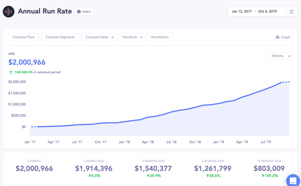 차트메트릭의 연간 구독 매출 (Annual Recurring Revenue)이 오늘 아침 200만달러를 넘었다. 매출이 발생하기 시작한 이후 첫 100만달러에 도달하기까지 2년이 걸렸는데, 1년이 걸리지 않아 그로부터 2배가 된 것.