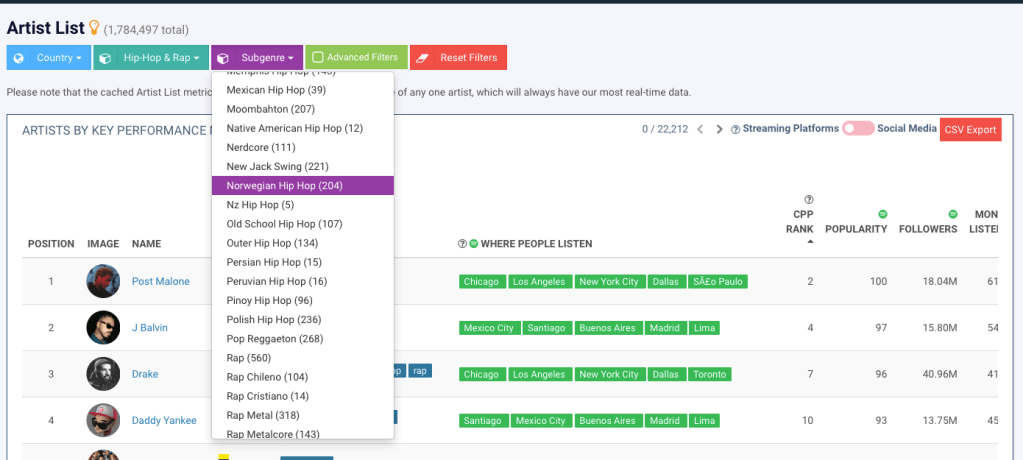 그 사이 많은 새로운 기능이 추가되었다. 우리가 트래킹하는 아티스트 수는 180만명이 되었고, 그들을 출신 나라, 또는 ‘노르웨이 힙합 Norwegian Hip Hop’같은 장르 이름으로 검색할 수 있다.