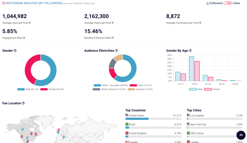 특히 고객들의 관심을 많이 받은 기능은 인스타그램 팬 분석이었는데, 아래는 포스트 말론(Post Malone)의 팬 분석 결과이다. 매번 포스팅할 때마다 무려 100백만의 좋아요(Like)를 받고, 여자보다 남자 팔로워가 더 많으며, 무려 14%가 아시아인다. 미국에 41%의 팔로워가 있는데 그 다음으로 브라질에 팔로워가 많다 (6.51%). 이 모든 인스타그램 통계는 매일 자동으로 업데이트된다.