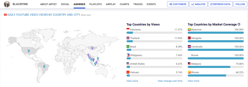 아래는 블랙핑크의 유투브 소비량 분포인데, 인도네시아와 태국, 브라질, 필리핀에서 소비가 많이 일어나고 있다. 한국은 11위에 그친다. 흥미로운 것은 ‘시장 점유율 분석’으로는 미얀마, 몽고, 캄보디아, 그리고 브루나이에서, 100%를 차지하고 있다는 것. 다시 말하면, 이 4개 나라에서 유투브를 통해 음악을 듣거나 뮤직비디오를 보는 사람들에게 블랙핑크가 가장 인기가 있다는 뜻.