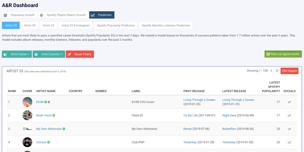 예측 기능도 추가했는데, 머신 러닝을 통해 지난 3년간 도약에 성공한 가수들의 데이터를 분석해서 만든 모델을 이용하여, 현재 무명 가수들의 ‘도약 성공률’을 예측해서 순위대로 보여준다.