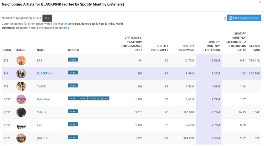같은 장르에 있는 다른 가수들과의 비교를 쉽게 할 수 있도록 ‘장르 클러스터’ 기능도 추가했는데, 스포티파이 소비량에 따르면 블랙핑크 위는 BTS가 유일하고, 그 아래에 트와이스, 레드 벨벳, 숀(SHAUN), EXO, (G)I-DLE이 있다.