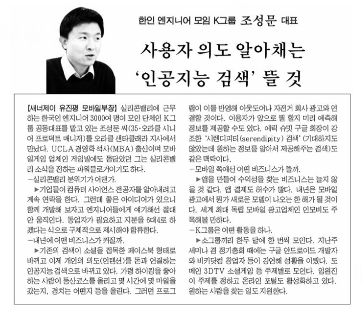 “사용자 의도 알아채는 ‘인공지능 검색’ 뜰 것“, 매일경제 유진평 기자 인터뷰 (2011/12/25) (12월 26일자 매일경제 3면) [jpg]