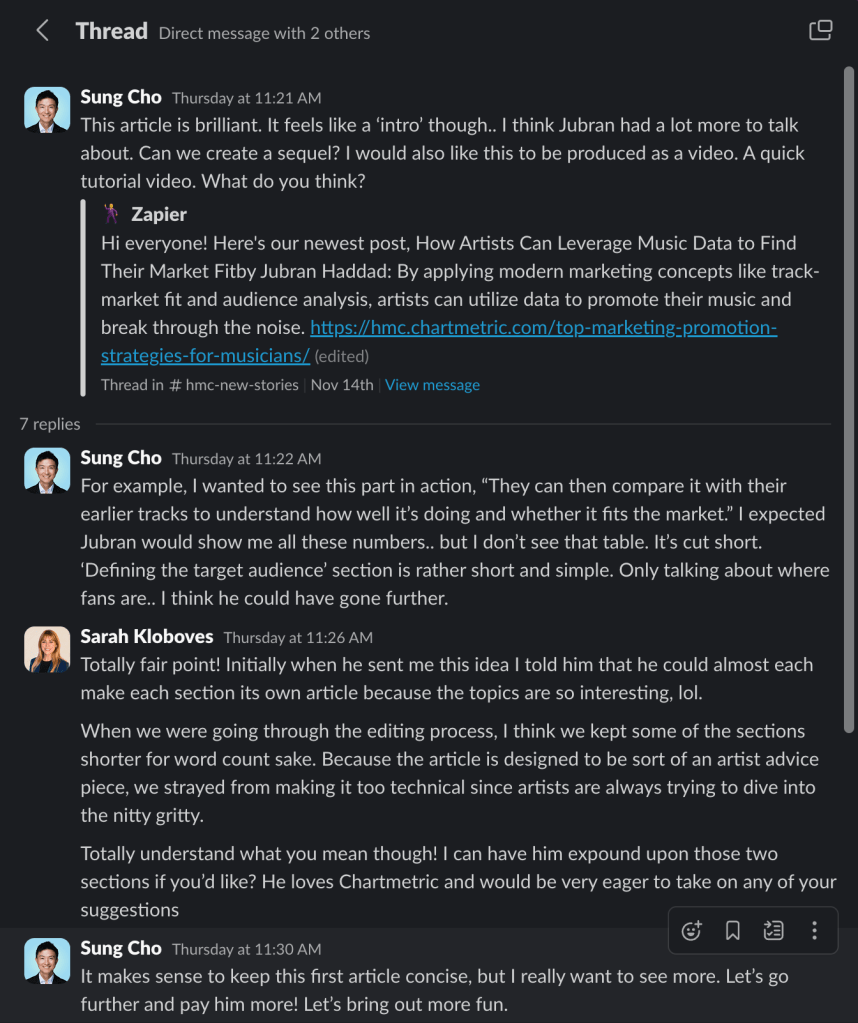 그렇다 보니, 내가 거의 관여하지 않았던 부서에서 놀라운 결과를 만들어낼 때가 종종 있는데, 우리 회사의 블로그 사이트가 그렇다. 최근 여기에 ‘제품-마켓 핏’의 개념을 음악과 그 청취자의 개념에 적용해서 쓴 글이 올라왔는데 글이 너무 마음에 들어 담당자와 즐거운 대화를 주고 받았다. 얼마 전에 “직원들에게 칭찬을 자주 하는 것이 좋은가요, 말을 아끼는 것이 좋은가요? 칭찬은 어떤 식으로 하나요?” 라는 질문을 받은 적이 있는데, 거기에 대한 내 대답은, ‘진심으로 감동했을 때 칭찬하고, 단순히 “잘했다” 고 하기보다는 구체적으로 어떤 부분에서 감동을 받았는지, 그리고 일을 더 발전시킬 수 있도록 자원을 더 지원해주는 것을 언급하면 좋겠다는 것’이었다. 참고로 그 때 주고 받았던 대화를 여기에 붙인다.