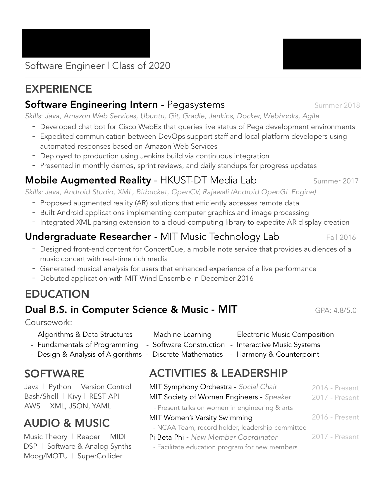아래는 그와 함께 온 이력서. 2016년에 입학하자마자 MIT 의 음악 기술 실험실에서 경험을 쌓았고, 1학년 마친 여름 방학, 그리고 2학년 마친 여름 방학에 모두 인턴십 등으로 실질적인 경험을 쌓은 것이 돋보인다. 그 외에 MIT 심포니 오케스트라와 여성 엔지니어 클럽, 그리고 수영 팀에서 리더십 역할을 맡았다는 것도 눈에 띈다. 또한 만점에 가까운 학점 (4.8/5.0)도.