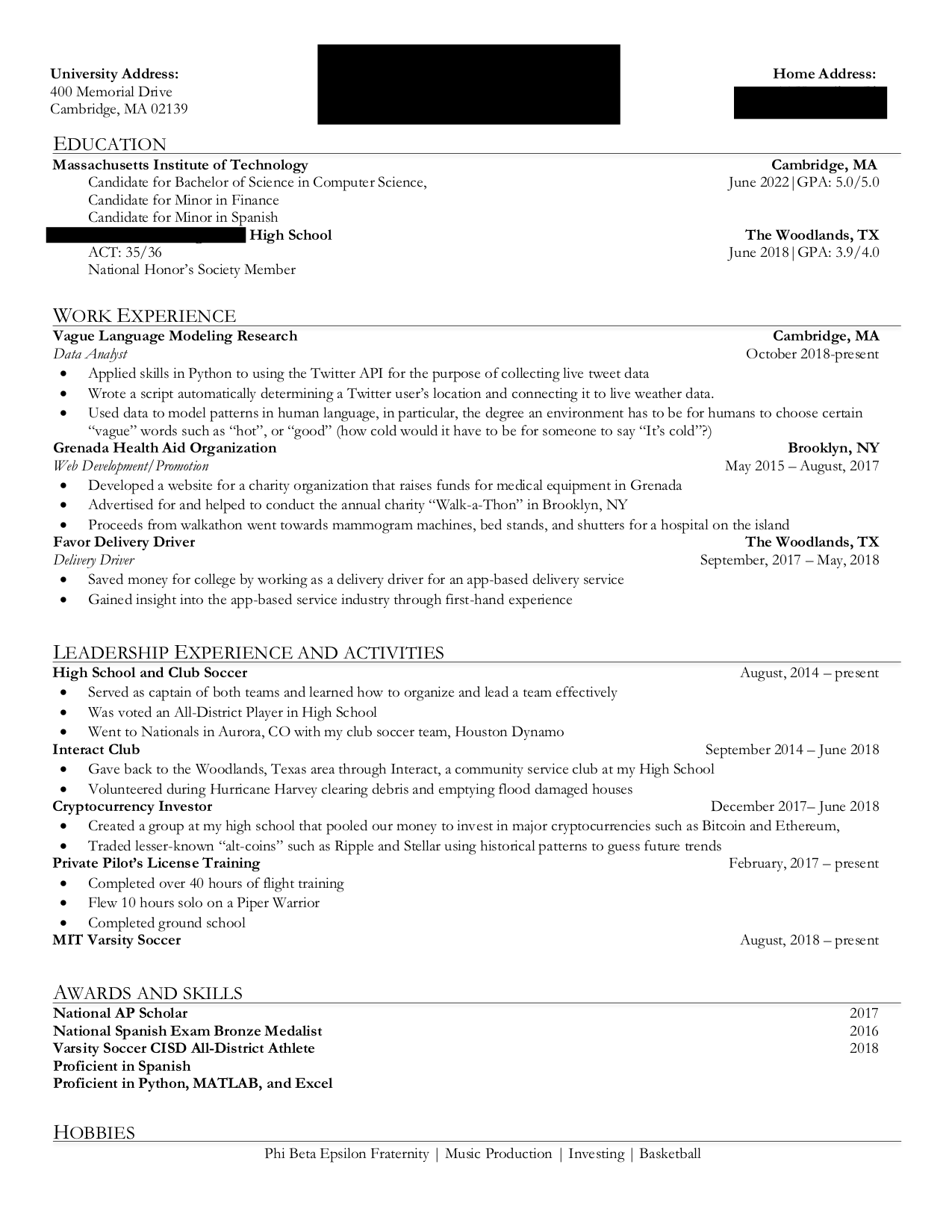아래는 그와 함께 온 이력서(resume)이다. 이름과 주소 등은 지웠다. 고등학교 때 축구팀 주장이었고, 40시간의 비행 훈련을 마치고 홀로 10시간 비행한 경험까지 있다. 거기에 더해 내신은 1등급(3.9/4.0)이었고, 만점에 가까운 ACT 점수(35/36)를 받았고(전국 상위 0.8%에 해당), National Honor Society의 멤버였고, MIT에서는 전 과목 A+ 학점 (5.0/5.0)을 취득했다.