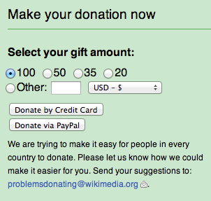 넷째, PayPal 등 쉬운 결재 방식 덕분에 지불 과정에 마찰(friction)이 없다. 물건을 사겠다고 결심하는 것과 달리, 기부는 대개 순간적이고 감정적인 결정이다. 기부하겠다고 결심을 하고 나서 버튼을 눌렀는데 엑티브 엑스 깔고, 공인인증서 암호 입력하고, 보안 프로그램 업데이트하고, 휴대폰 인증 하다보면 ‘그냥 안하고 말지’하고 중간에 그만둘 수가 있는데, 페이팔을 이용하면 그런 모든 과정이 없다. 기부 액수를 정한 후 페이팔 아이디와 암호만 입력하면 즉시 지불이 된다. 아래는 위키미디어 파운데이션의 기부 페이지의 일부분이다.
