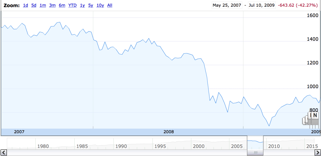 MBA 입학한 2007년 여름(왼쪽 끝)부터 2009년 여름(오른쪽 끝)사이의 S&P 500 지수 변화 (출처: Google Finance)